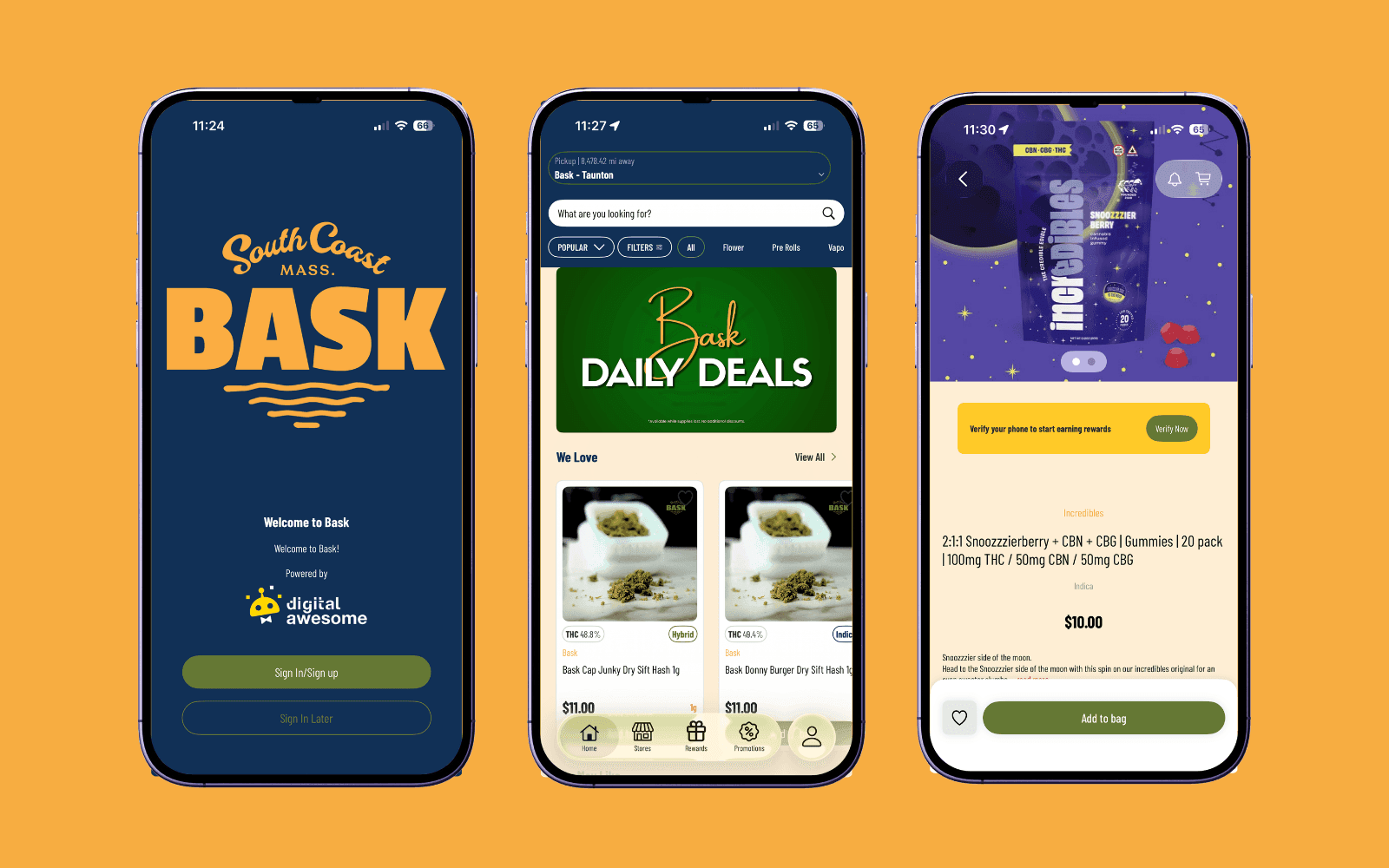 To bring this vision to life, BASK partnered with Digital Awesome to launch the BASK dispensary mobile app — a fully branded mobile platform designed to mirror the BASK website experience while introducing new incentives that encourage customers to sign in, browse products, and check out directly from their phones.